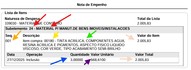 | Seta laranja | Indica a sequência do item do empenho. Ex: 1, 2, 3 … |