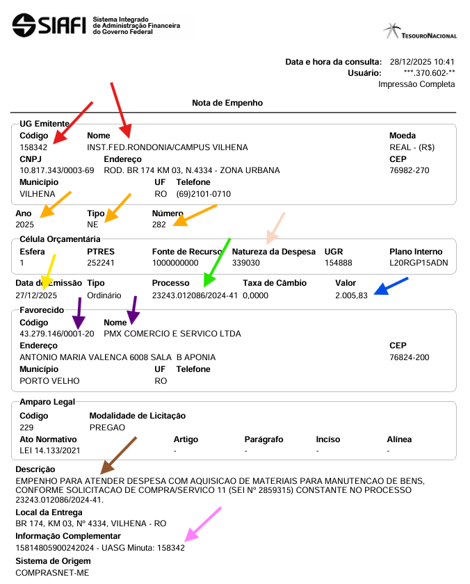 | Setas vermelhas | Indicam o código e nome da unidade emissora do empenho |