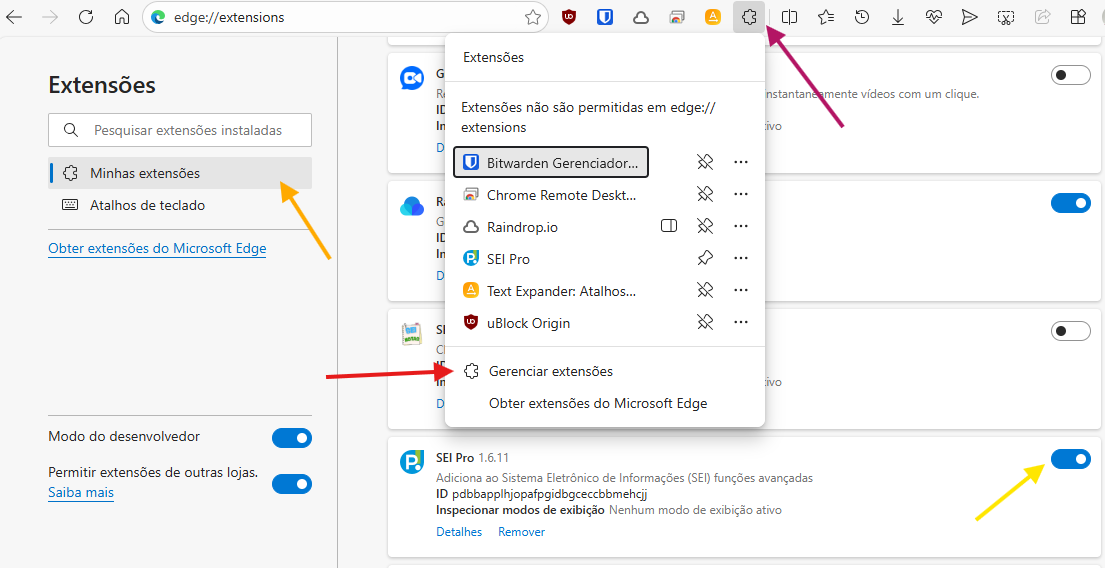 Clique em Gerenciar extensões (seta vermelha)