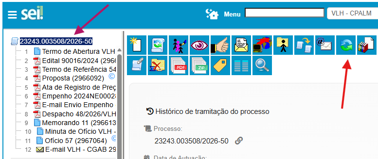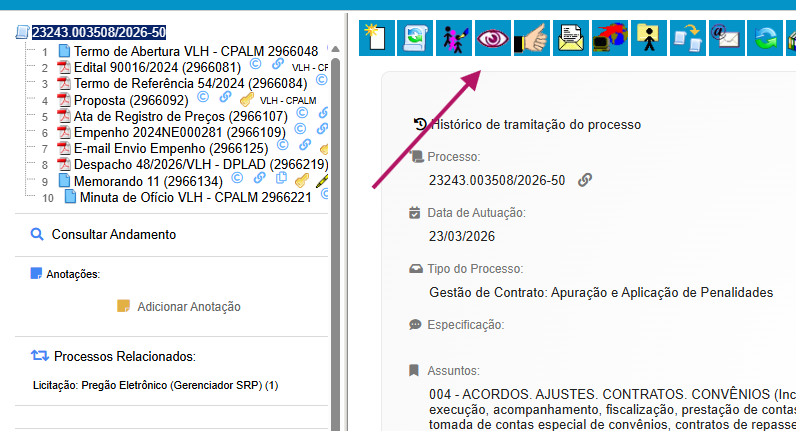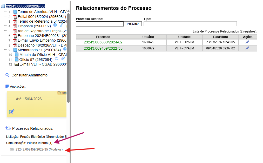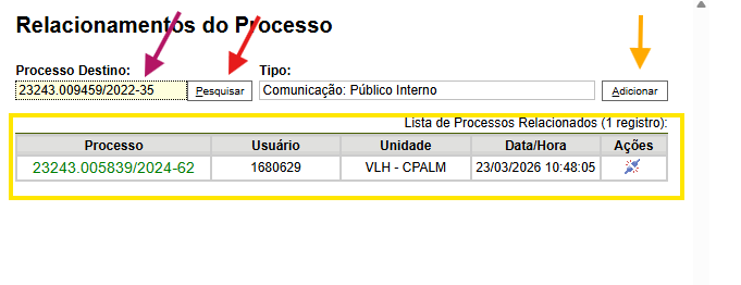 Os processos relacionados ficam agrupados por Tipo. Ao clicar nele (seta magenta), os processos serão exibidos (seta vermelha).