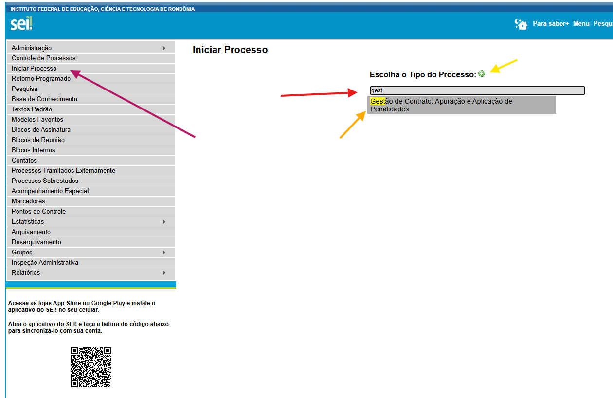 Na página inicial do SEI, clique em Iniciar Processo (seta magenta)