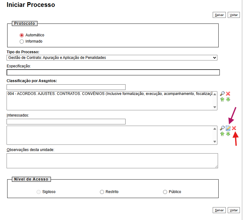 | Interessados | Já vem preenchido com os mesmos interessados do processo, preenchido na etapa anterior | |