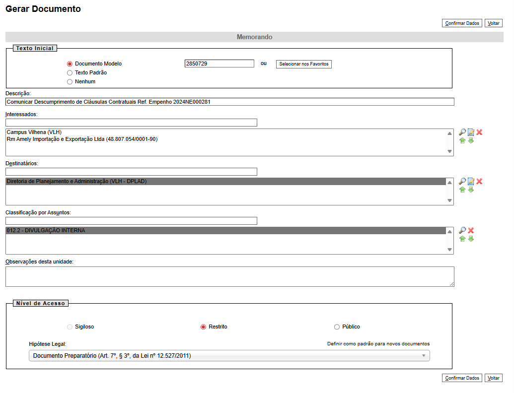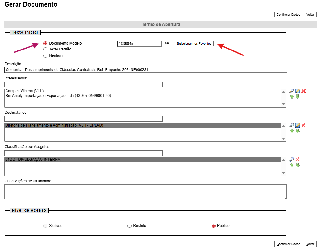 | Texto Inicial | Documento Modelo | Utilizar sempre o modelo disponível na lista exibida ao clicar em Selecionar nos Favoritos. O modelo número 1839045 é o utilizado atualmente. |