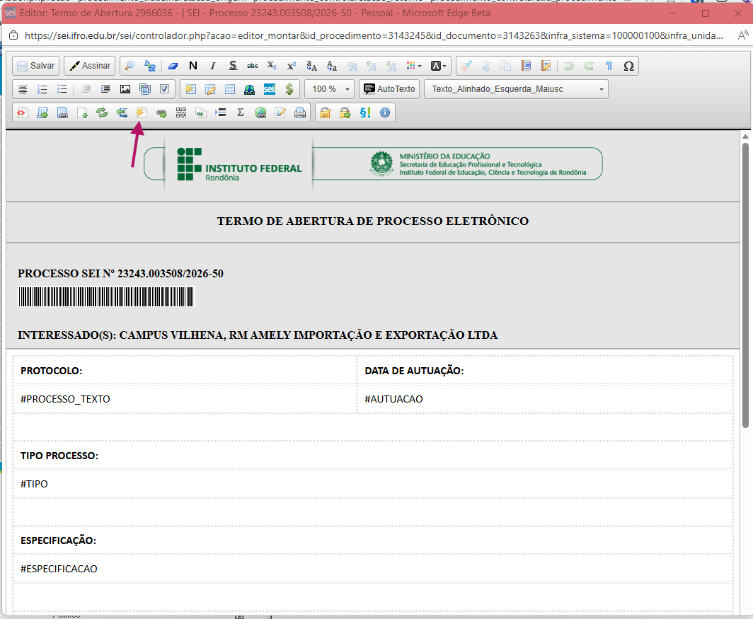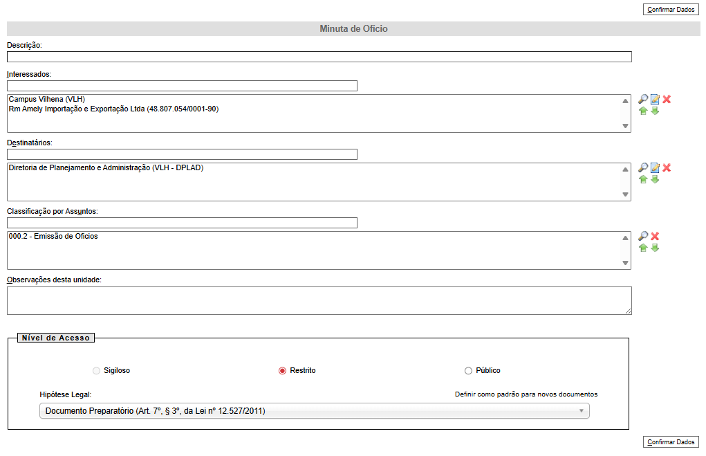 Em seguida, crie um documento do tipo Minuta de Ofício, utilizando um modelo que mais se aproxime do caso.