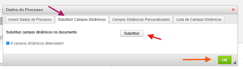 Clique em Substituir Campos Dinâmicos (seta magenta), depois em Substituir (seta vermelha) e depois em OK (seta laranja).