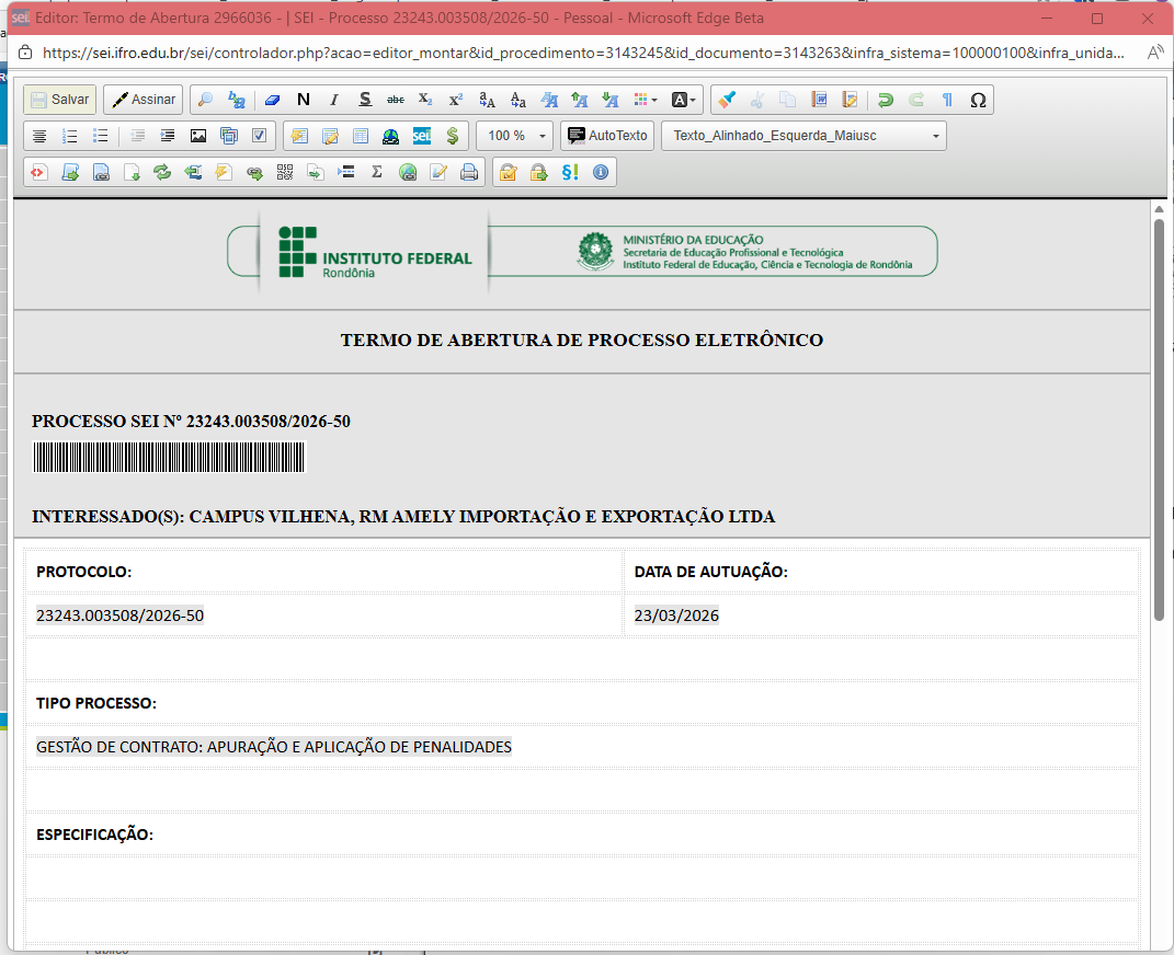 Isso preencher os campos do Termo de Abertura com dados do processo.