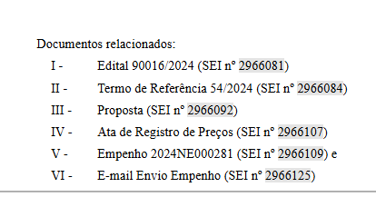 Em Documentos relacionados listar todos os documentos do processo e seus respectivos Nº SEI, exceto Termo de Abertura e o próprio Memorando.