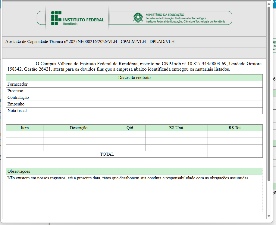| Observações | Observações sobre o fornecimento | Por padrão, consta que não há nenhum registro que desabone o fornecedor. Mas esse é o lugar para registrar atrasos na entrega ou nas substituições de materiais, dificuldade de contato por exemplo |