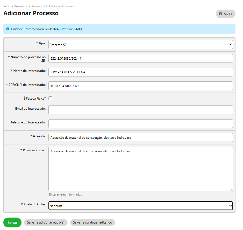 | Número do processo no SEI | Informe o número do processo. Exemplo: 23243.012086/2024-41 |