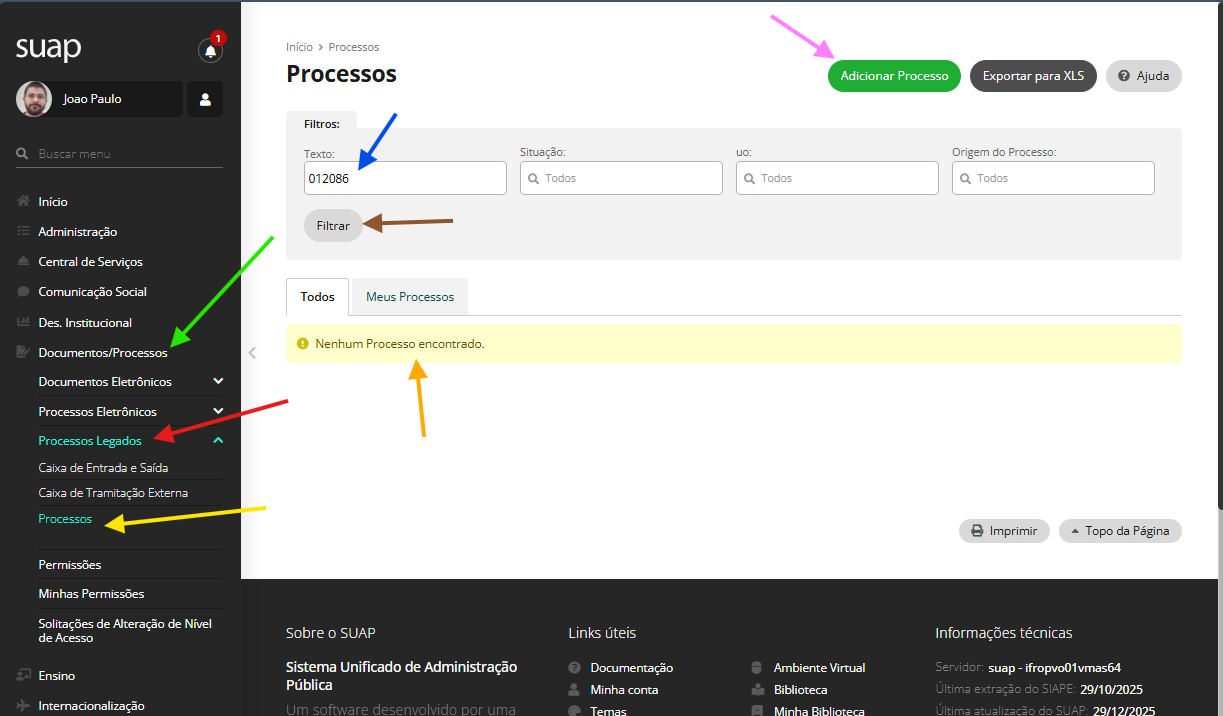 Clique em Documentos/Processos (seta verde) → Processos Legados (seta vermelha) → Processos (seta amarela)