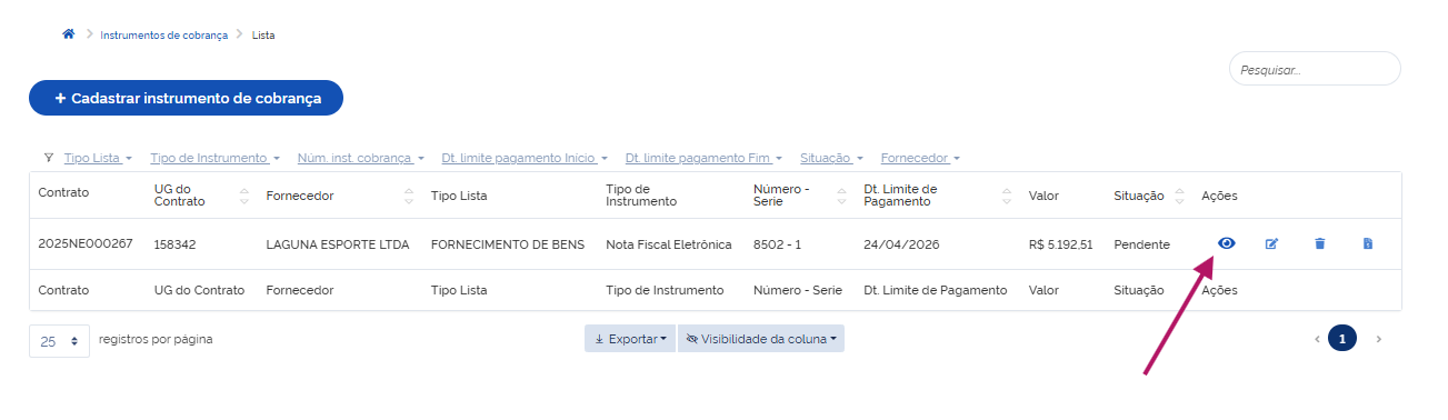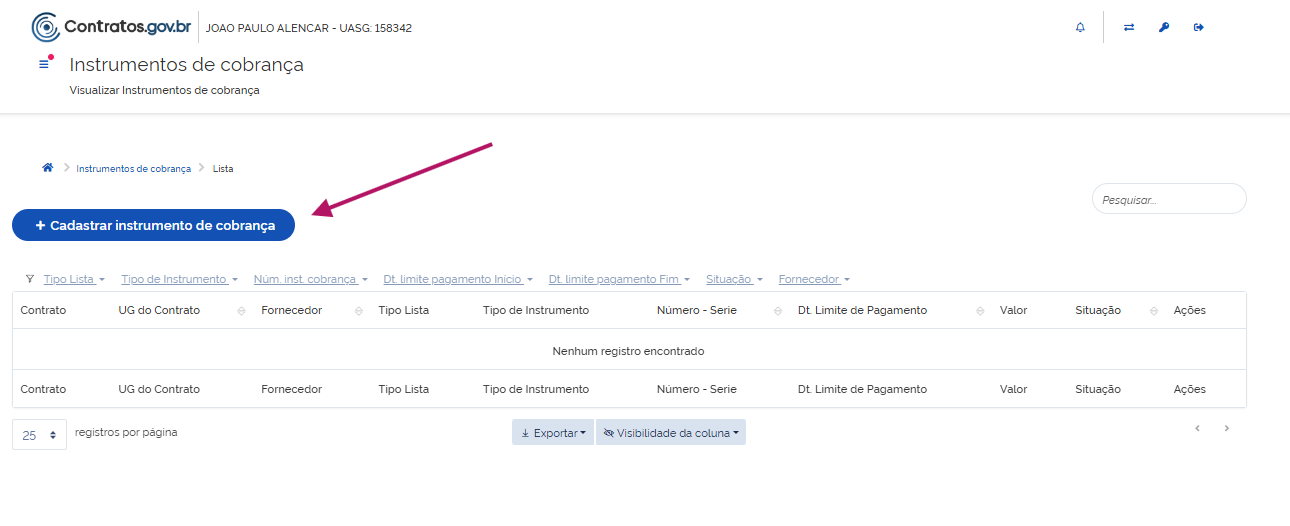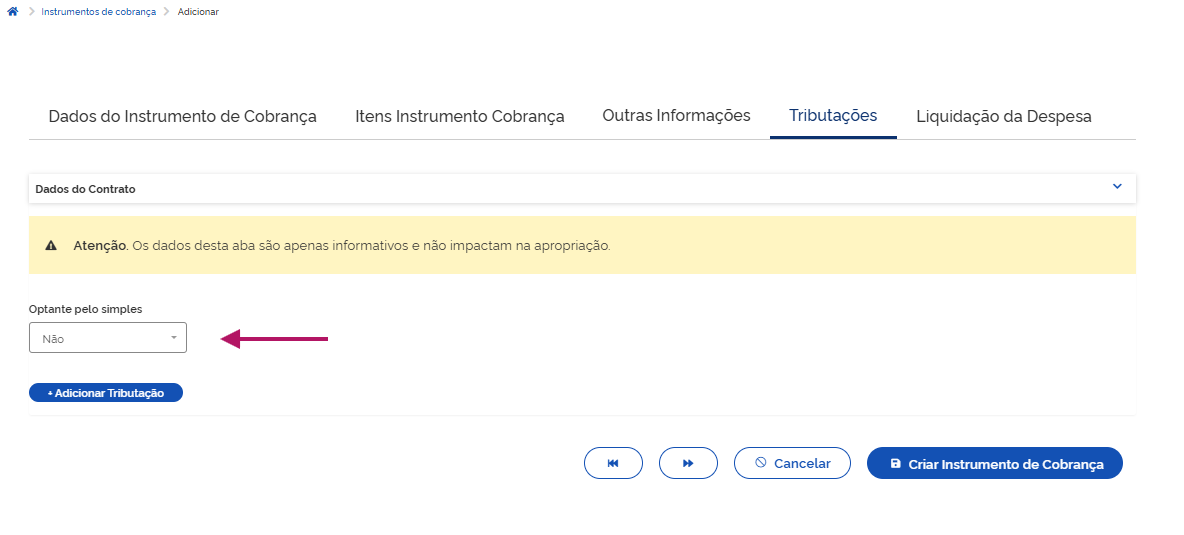 Clique em Adicionar Instrumento de Cobrança do Contrato.