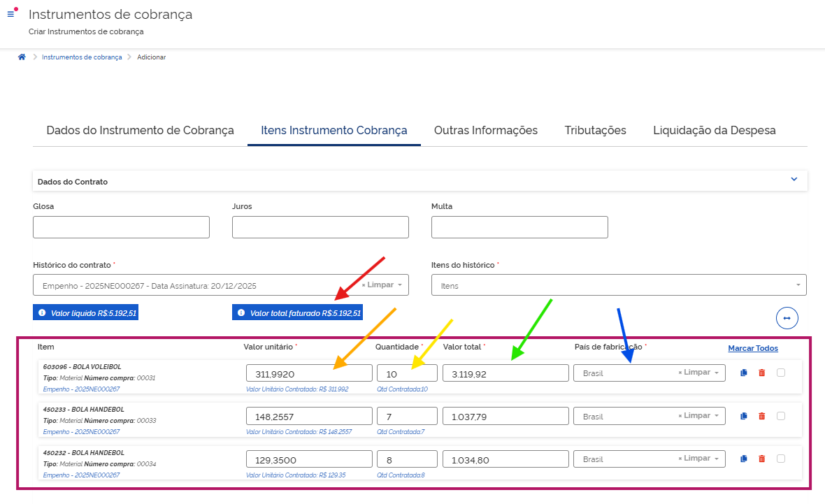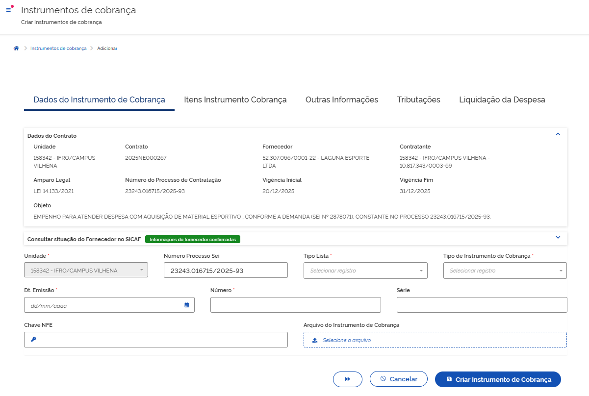 Após preencher os campos, clique em na aba Itens Instrumento de Cobrança.