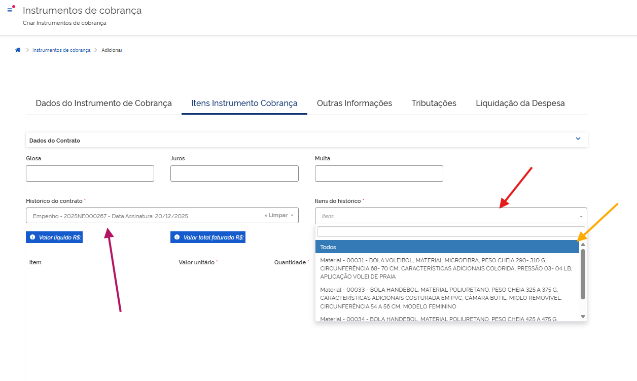 Selecione o empenho em Histórico do contrato (seta magenta) e depois clique em Itens do histórico (seta vermelha)