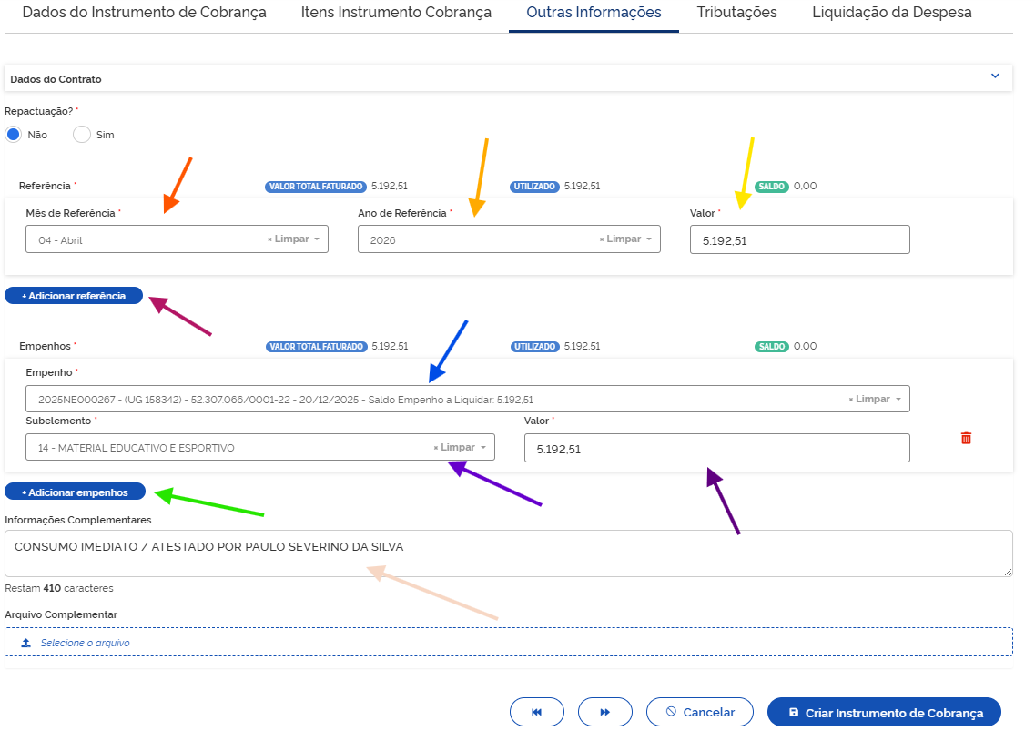 Clique em Adicionar empenhos (seta verde) e selecione o empenho (azul), o subelemento (seta violeta) e o valor total (seta roxa).