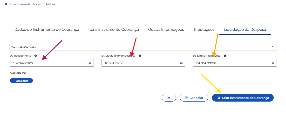 Em Dt. Recebimento (seta magenta) e Dt. Liquidação de Despesa (seta vermelha) informe a data do ateste.