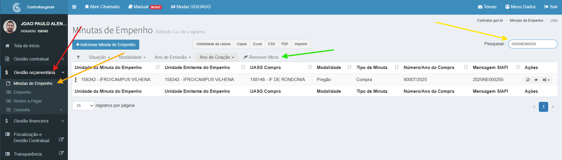 Informe no campo Pesquisar (seta vermelha) o número do empenho.