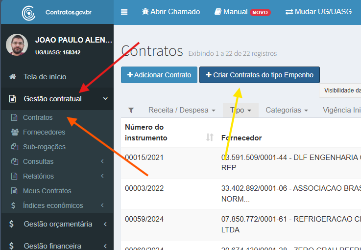Volte para a página inicial dos contratos, clicando em Gestão contratual (seta vermelha) → Contratos (seta laranja).