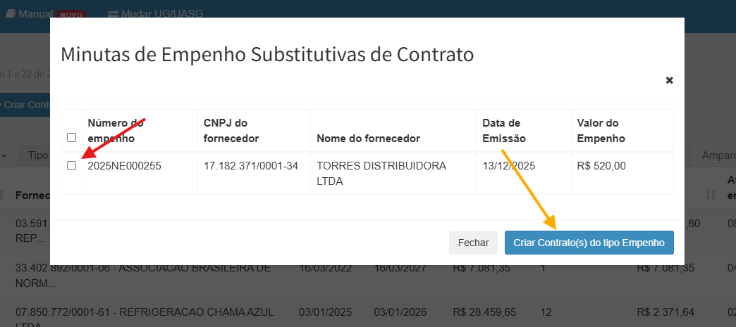 Quando a página carregar, clique em Criar Contratos do tipo Empenho (seta amarela).