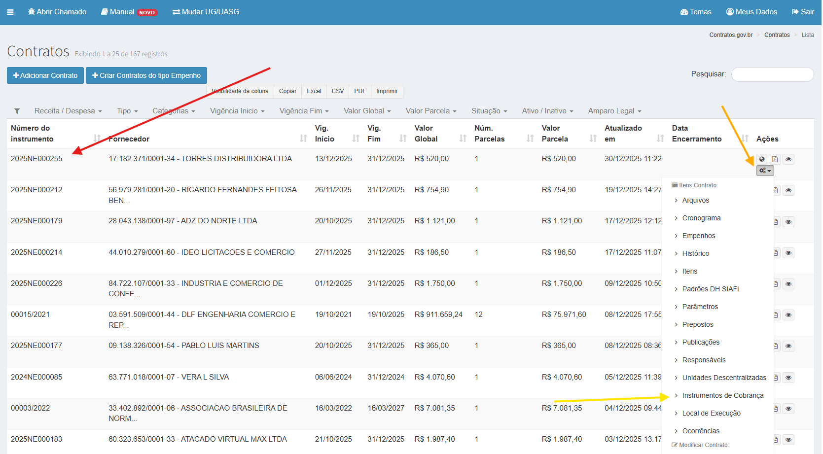 Clique em Mais (seta laranja) e em Instrumentos de Cobrança (seta amarela).