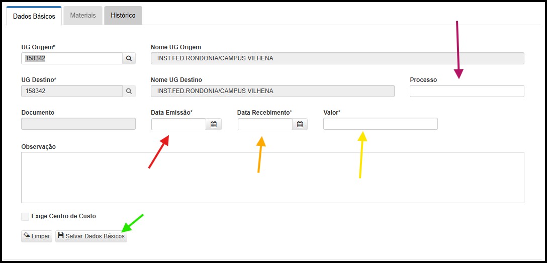 - Informe Data de Emissão e Data de Recebimento (setas vermelha e laranja). Da do dia do lançamento.