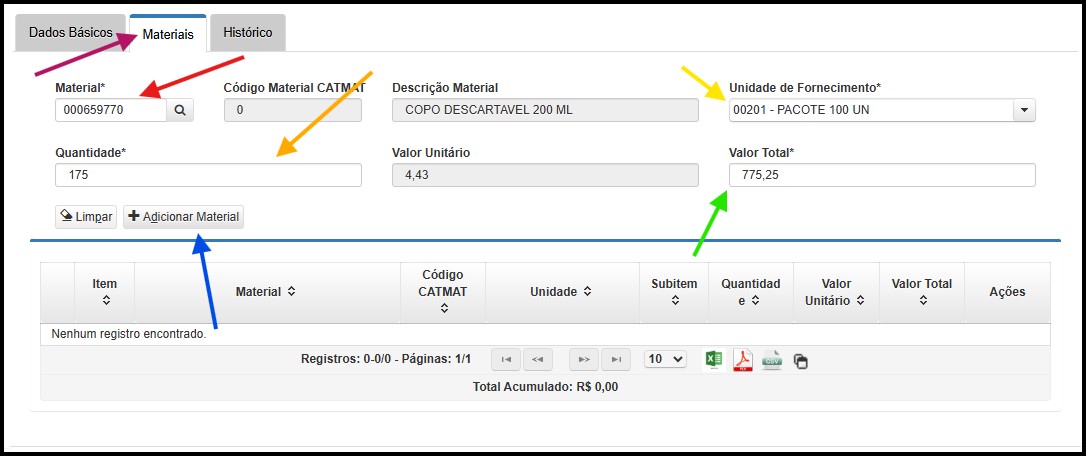 - Selecione o material, informando o código ou fazendo a busca (seta vermelha)