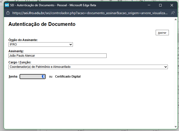 Caso tenha escolhido o Formato Digitalizado nesta Unidade na etapa anterior, o botão Autenticar Documento estará habilitado na barra de ferramentas do documento. Ao clicar nele uma nova janela aparecerá pedindo sua senha. Basta informar e assinar.