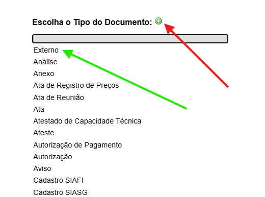 Na lista de tipos de documentos, escola Externo. Se não estiver disponível, clique no botão apontado pela seta vermelha que a lista completa aparecerá.