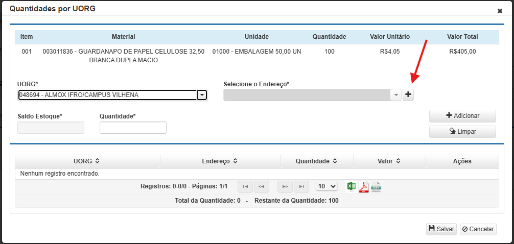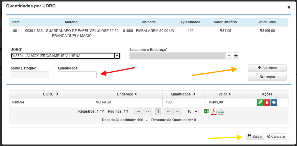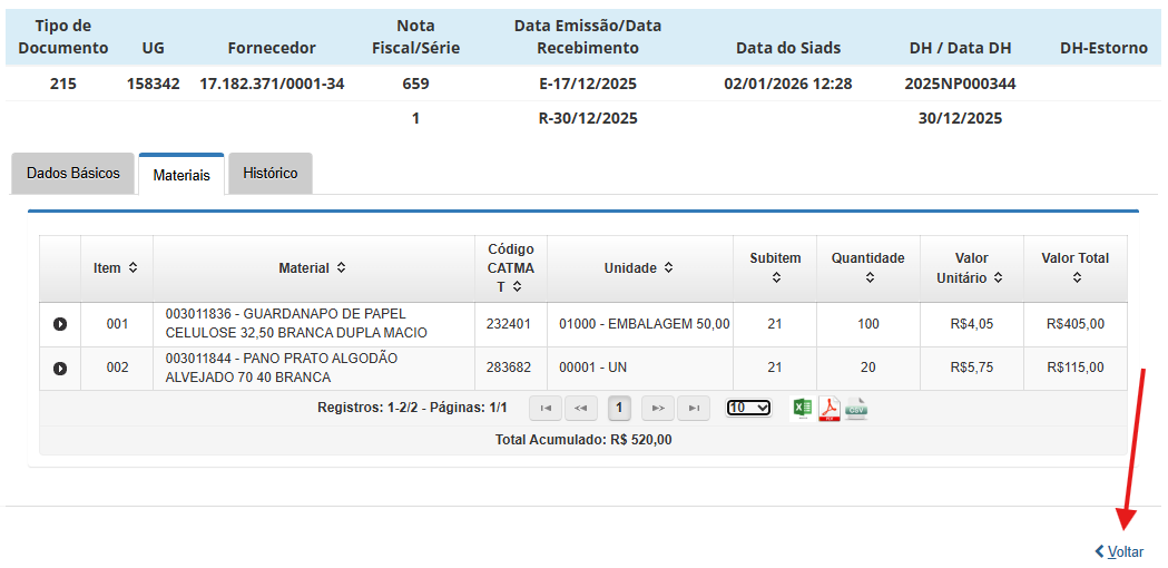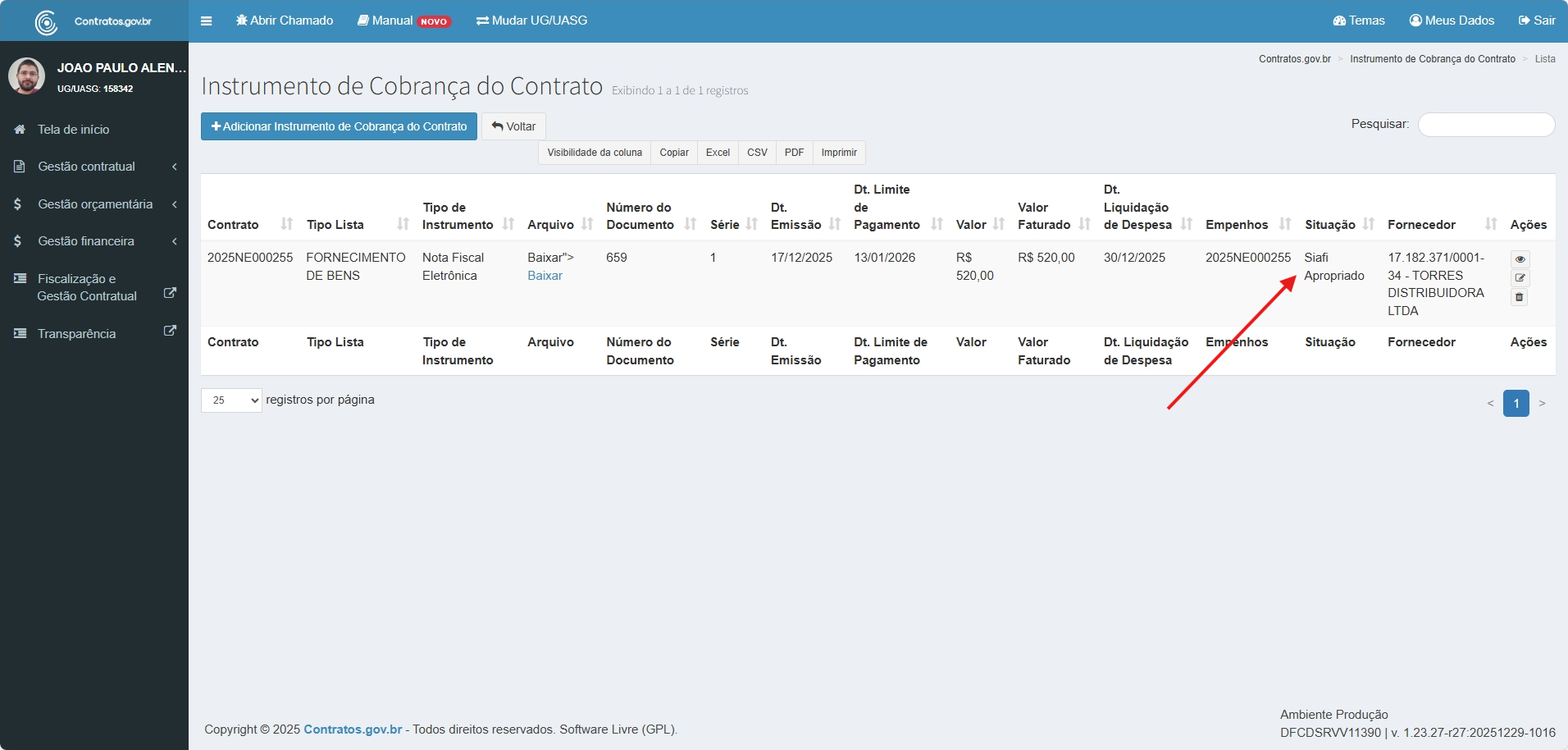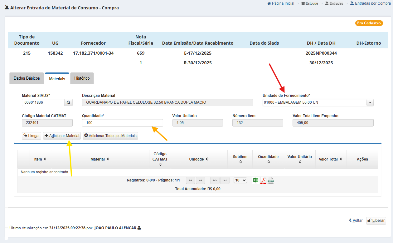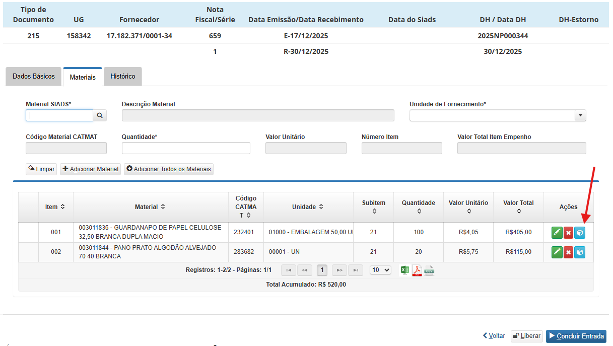 Os materiais poderão ser lançados no SIADS quando a situação do instrumento de cobrança mudar para Siafi Apropriado.