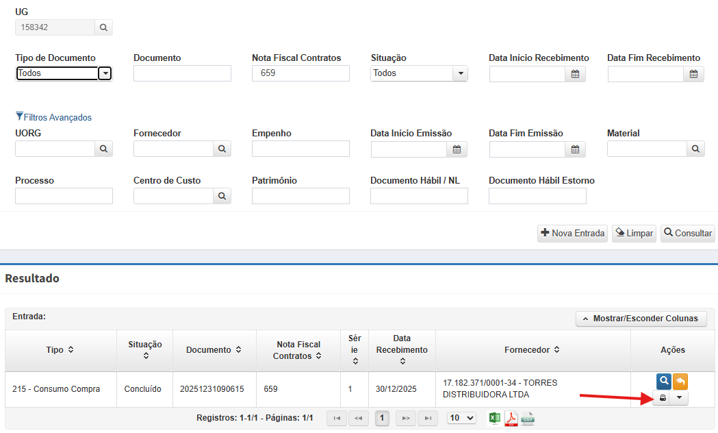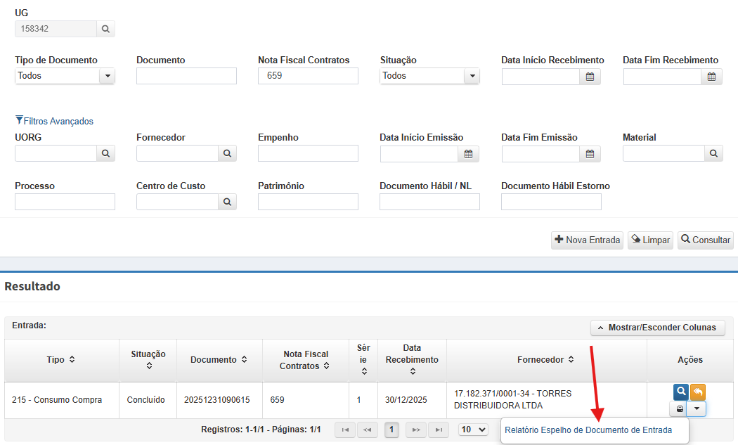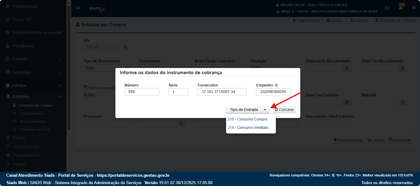 Após preencher os campos, clique na seta no botão Tipo de Entrada.