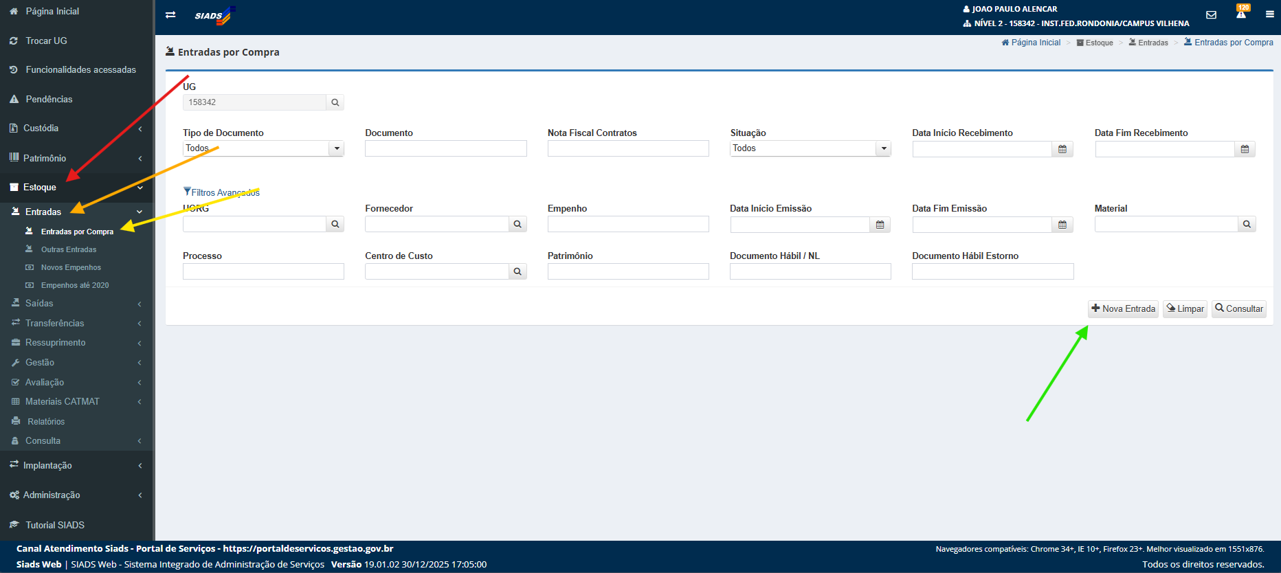 Clique em Estoque → Entradas por Compra → Nova Entrada.