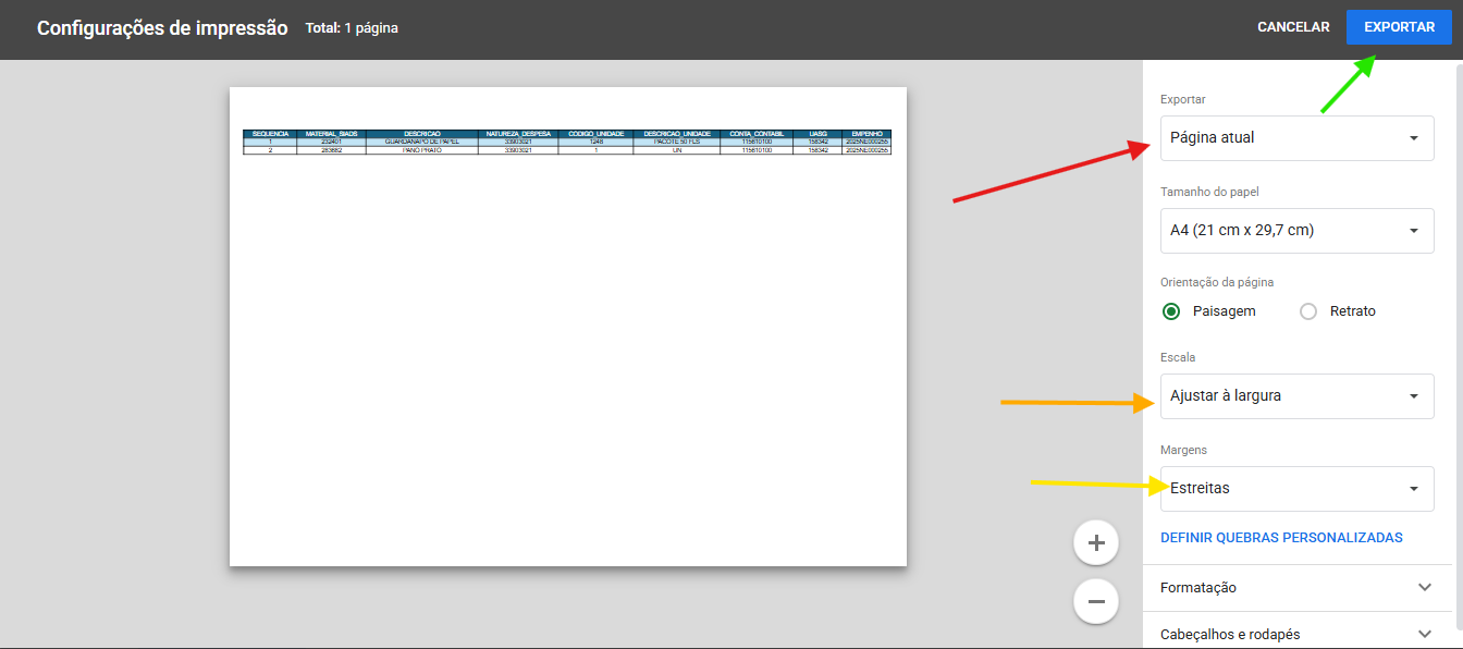 Certifique-se de exportar apenas a página atual (seta vermelha) e ajustar à largura (seta laranja) para que a planilha caiba em uma página. Se necessário, defina margens estreitas (seta amarela).