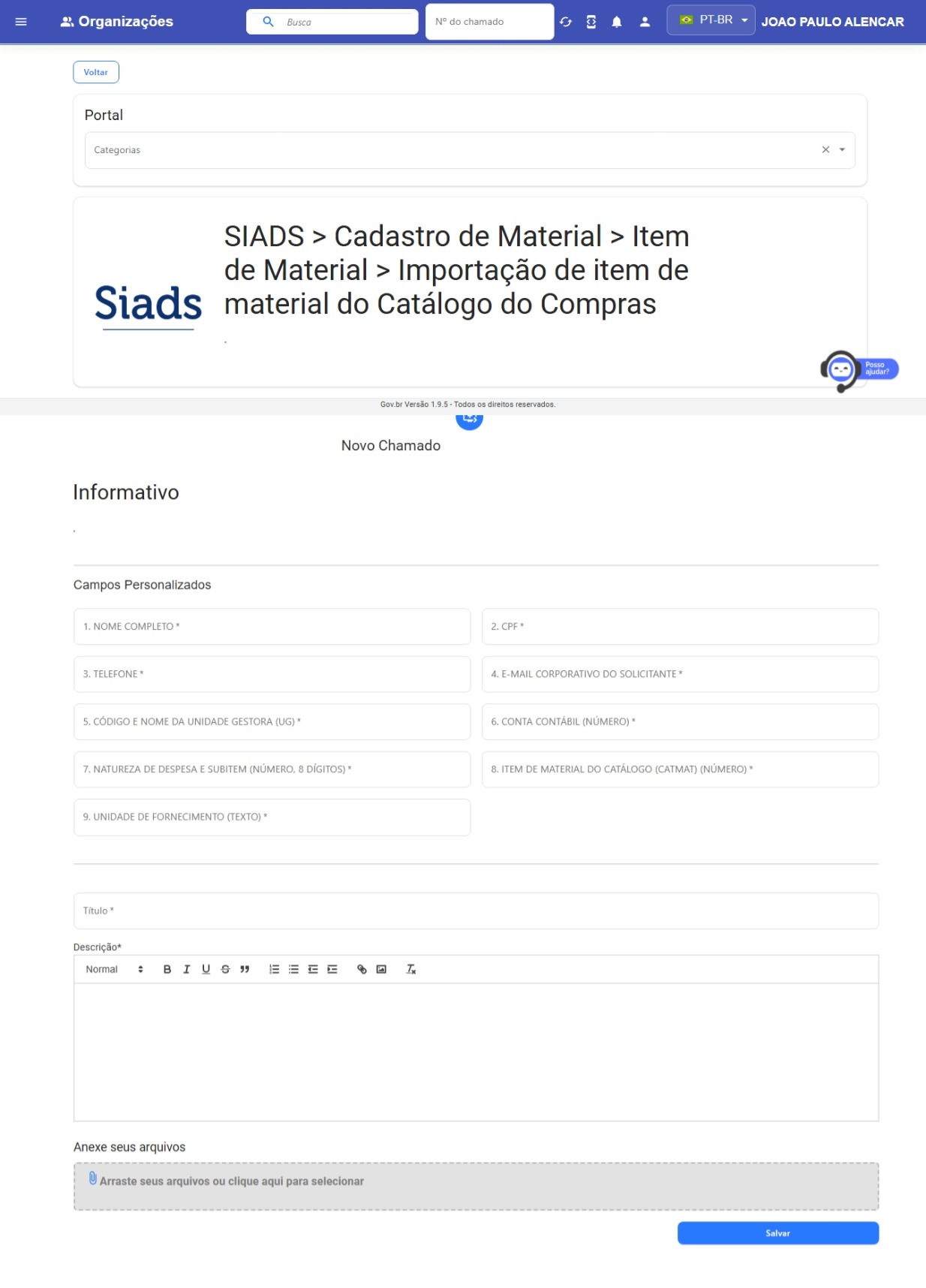 Na tela seguinte cliquem em Importação de item de material do Catálogo do Compras.
