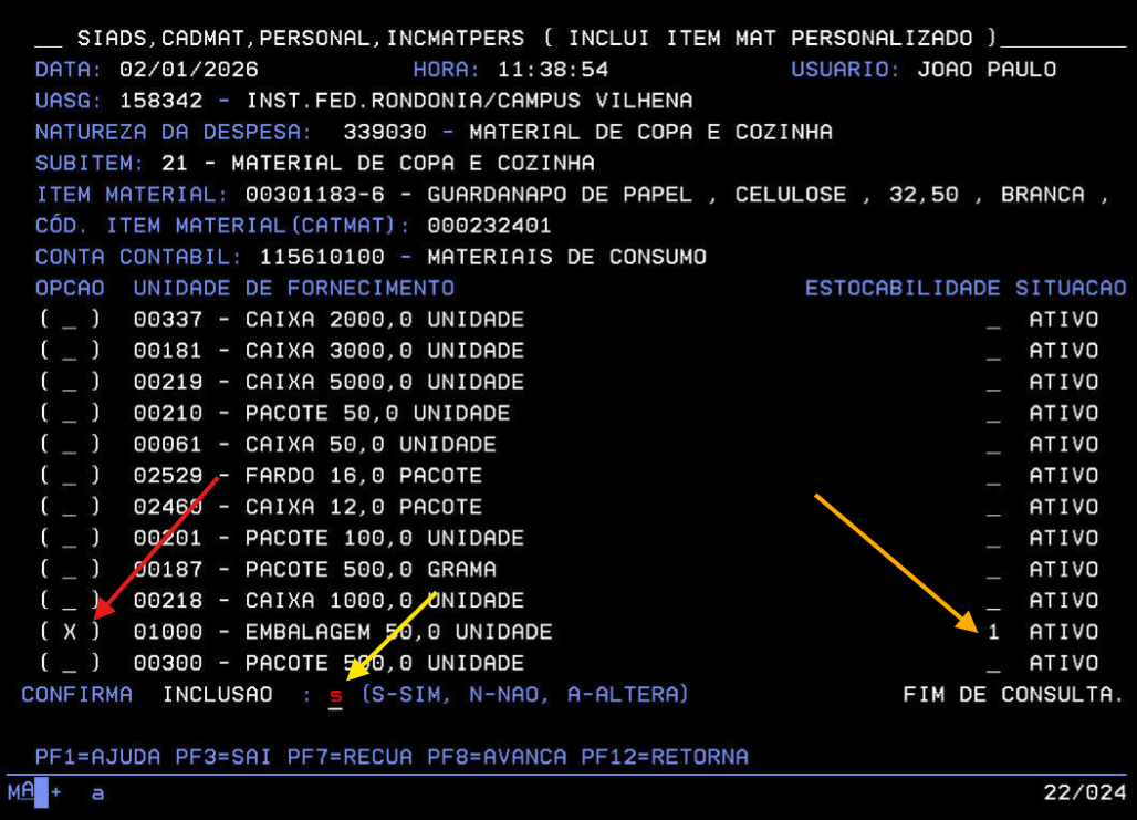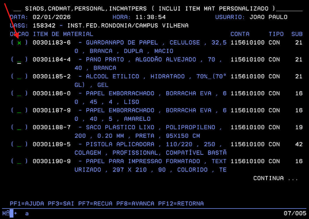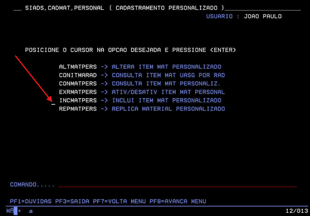 Clique ao lado da palavra INCMATPERS e pressione Enter.