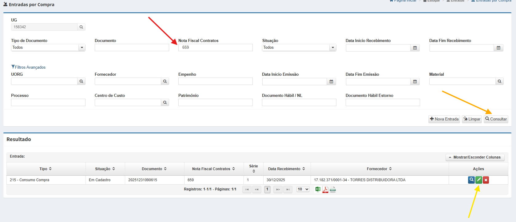 Como já iniciamos o preenchimento, no campo Nota Fiscal Contratos informamos o número da nota, clicamos em Consultar e depois em Alterar.