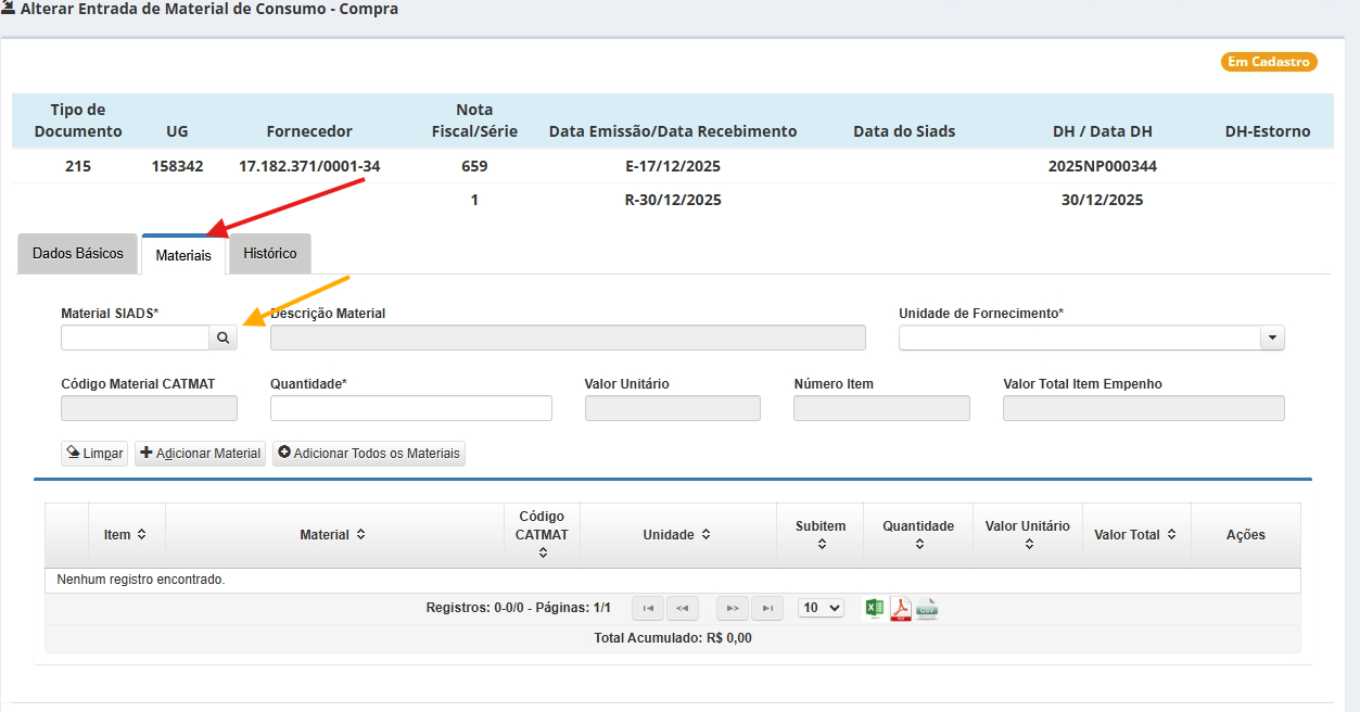 Clique na aba Materiais, depois na lupa ao lado de Material SIADS.