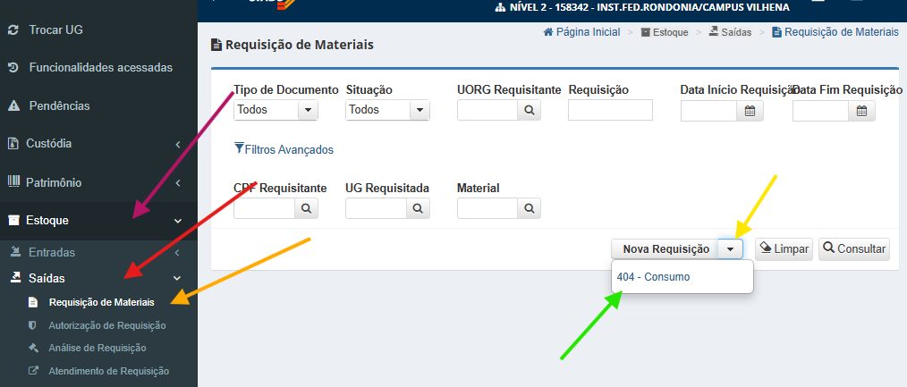 Observação 2: Caso o estoque total (seta roxa) esteja em diferentes endereços (seta magenta), basta adicionar (seta amarela) as quantidades de quantos endereços forem necessários.