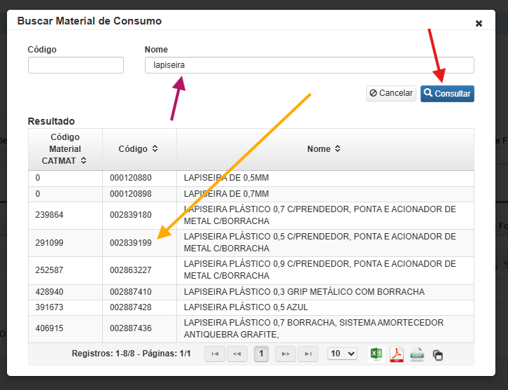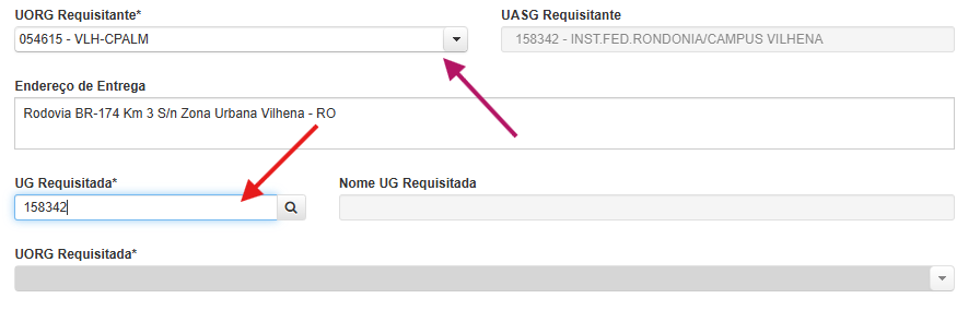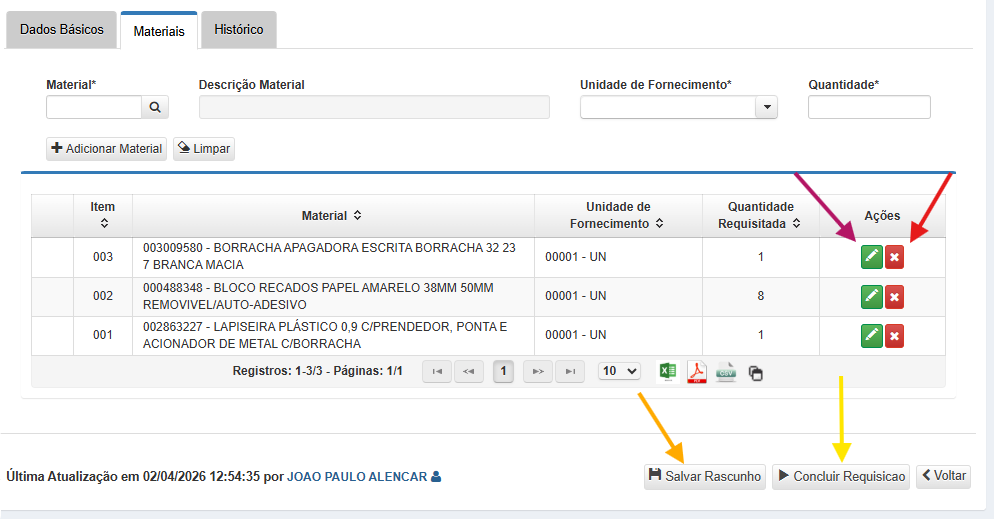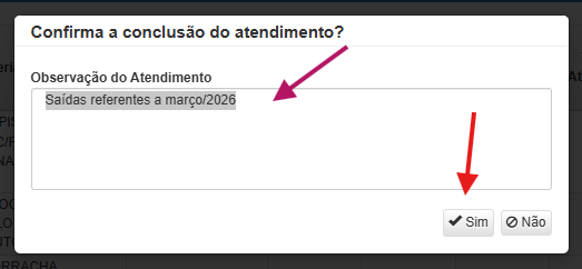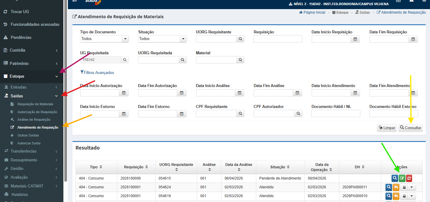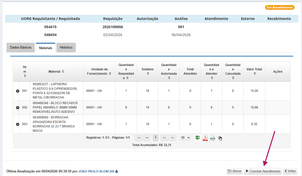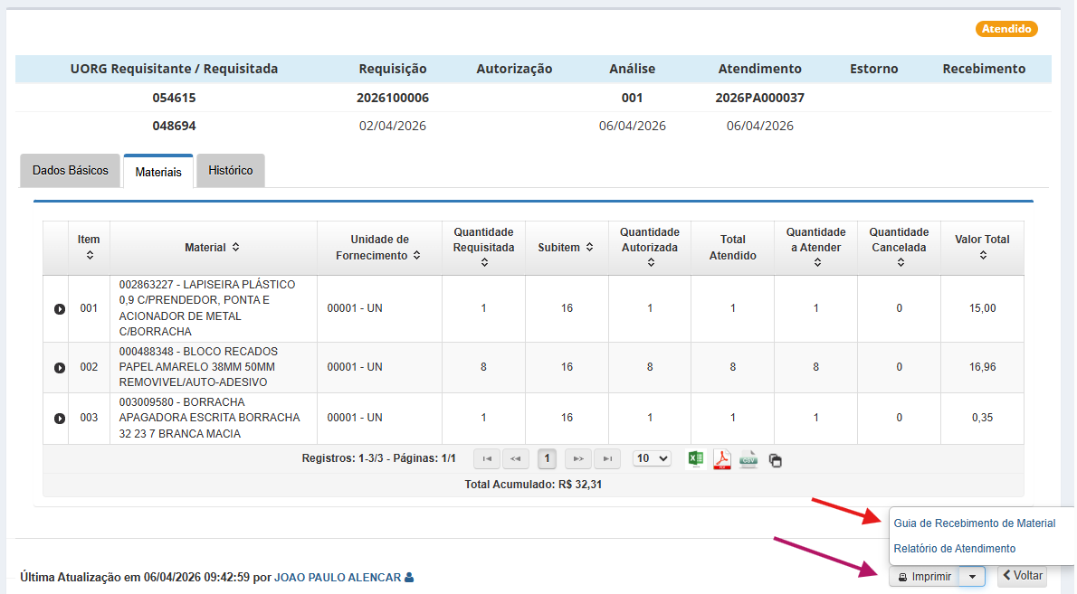 Observação 1: A quantidade atendida (seta laranja) precisa ser menor ou igual à quantidade disponível no endereço (seta vermelha).