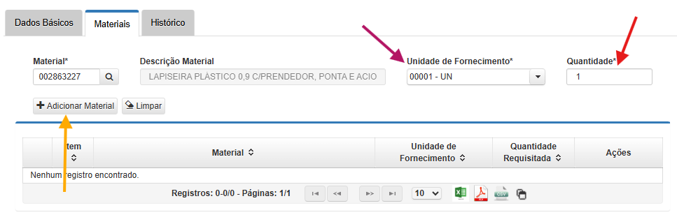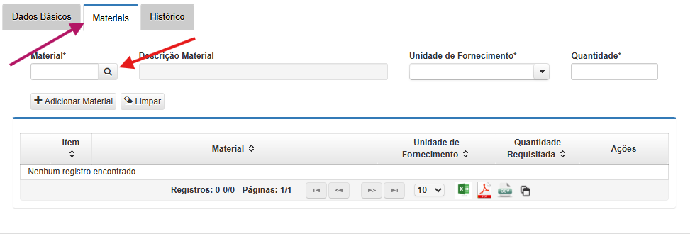Clique na aba Materiais (caso necessário) (seta magenta)