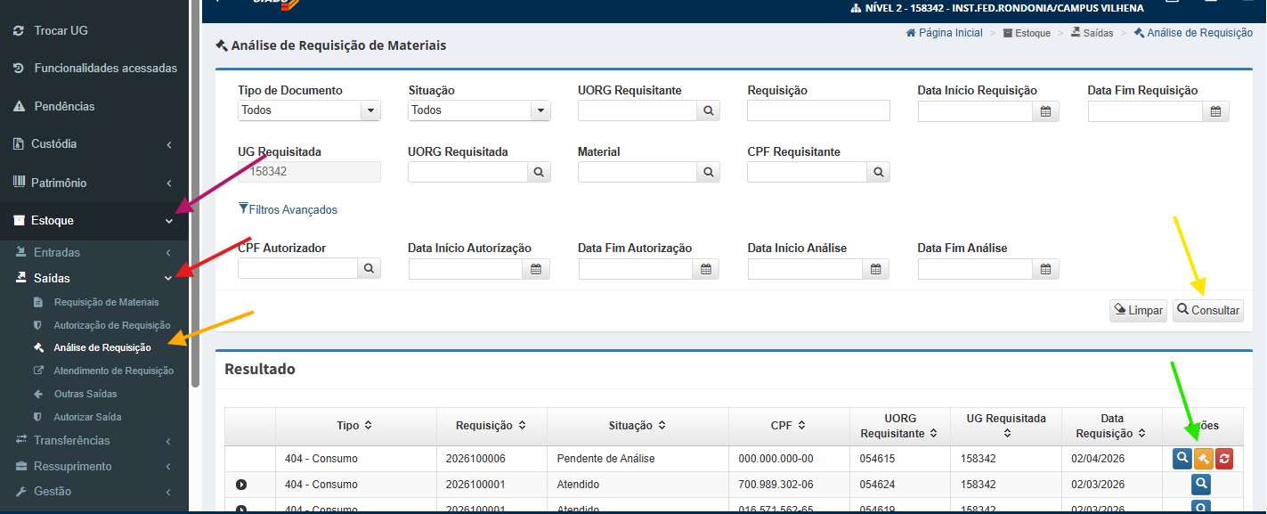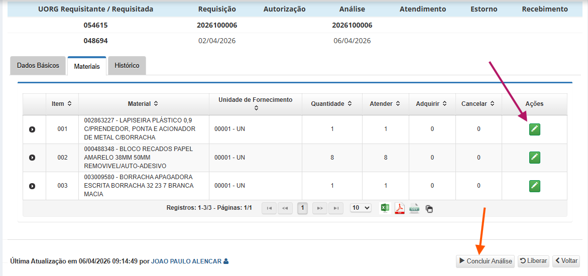 Observação 3: Para cancelar um item, caso o estoque (seta roxa) esteja zerado, informe no campo indicado pela seta azul a mesma quantidade solicitada (seta magenta) e cliquem em Salvar Análise do Item.