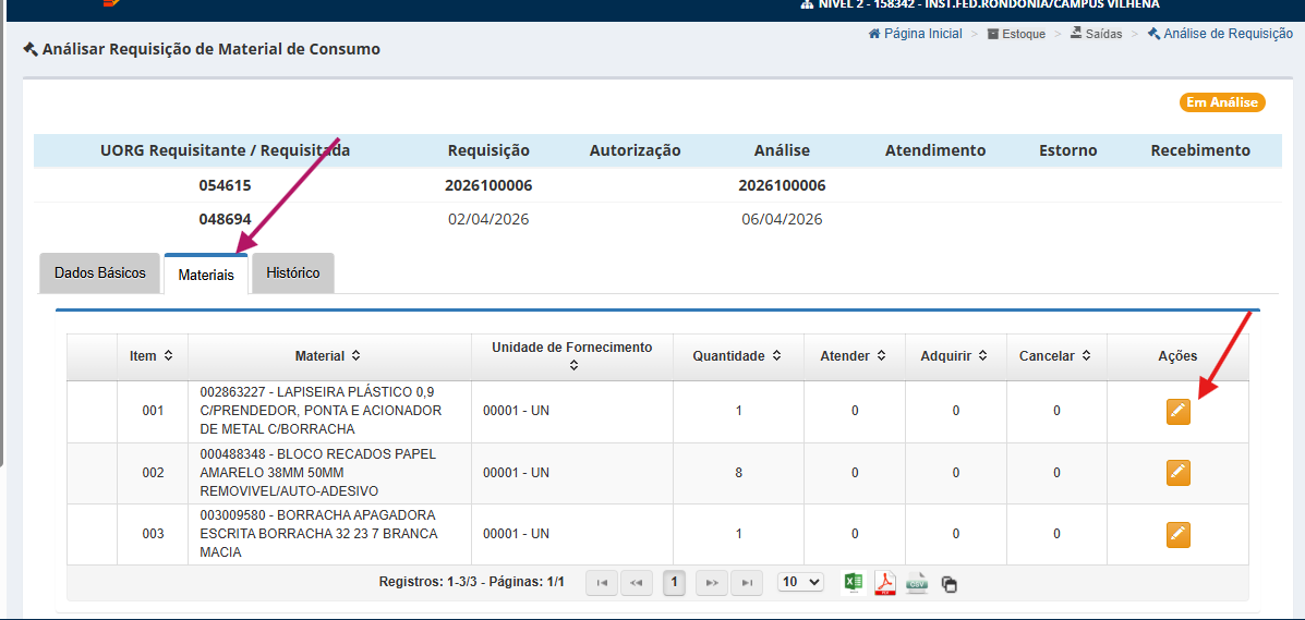 Após criar a requisição é necessário analisar e ajustar as quantidades solicitadas ao estoque disponível.